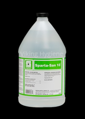 4/CASE Sparta-San 10 was formulated as a DISINFECTANT, SANITIZER, ALGAECIDE, and DEODORIZER. It can be used for anything from disinfecting hospital rooms and rinsing bar glasses, to keeping algae growth from occurring in pools. Sparta-San 10 does not contain cleaning agents, perfumes, or any other additives that can be a problem in food-contact areas. Broad-Spectrum Disinfectant: Sparta-San 10 has been registered with the Environmental Protection Agency as a bactericide, fungicide, and virucide. Spartan-San 10 has shown excellent activity against the pathogenic bacteria, Staphylococcus aureus, Salmonella cholerasuis, and Pseudomonas aeruginosa; the pathogenic fungi, Trichophyton interdigitale; and the pathogenic viruses, Vaccina, Influenza A2 (England), Herpes Simplex, and Adenovirus Type 5.